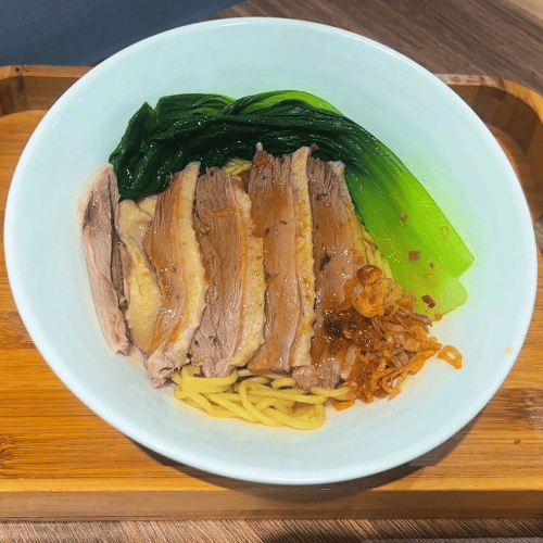 油麵基底搭配鵝肉片鵝肉丁配上少許青江菜及油蔥(乾麵醬為甜甜辣辣的)
